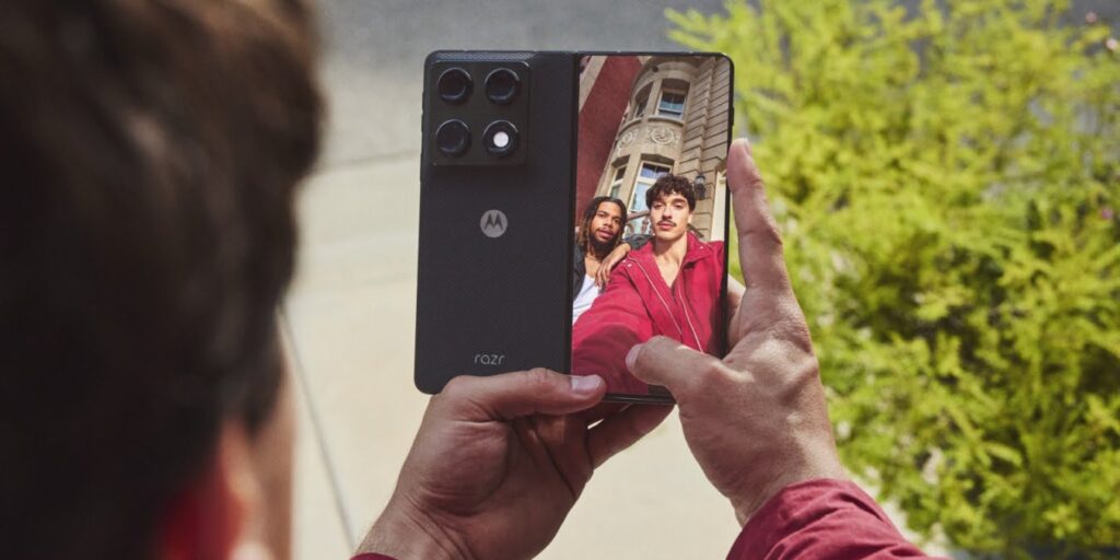 The Razr Fold features a 6.6-inch external display with a 21:9 aspect ratio and a resolution of 2520 x 1080 pixels. This panel features a 165Hz refresh rate, up to 6,000 nits of brightness, Dolby Vision and HDR10+ support, 10-bit color, and 100% DCI-P3 coverage. Gorilla Glass Ceramic 3 provides protection.